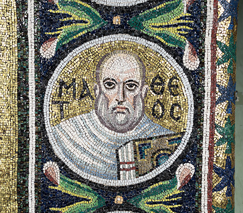 Portrait medallion of the Evangelist Matthew from the sixth century Sinai apse mosaic.