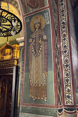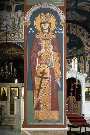 The Church of Panagia Kapnikarea dates to the eleventh century. It is one of the oldest churches in Athens. Photios Kontoglou painted the Theotokos Platytera in the apse in 1942, and completed the remaining icons on the walls in the early 1950s. The icon of Saint Catherine is on the east face of the arch to the north of the bema.
