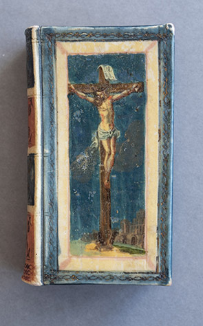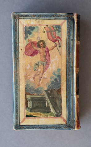 It was bound in vellum. The front has a depiction of the Crucifixion, and the back the Resurrection. The spine is flat but was stained blue and red in alternating panels to suggest four compartments, and stamped in gilt with floral designs. All edges are gilt, and the top and bottom edges are gauffered near the spine and foredge with dots and semi-circles.