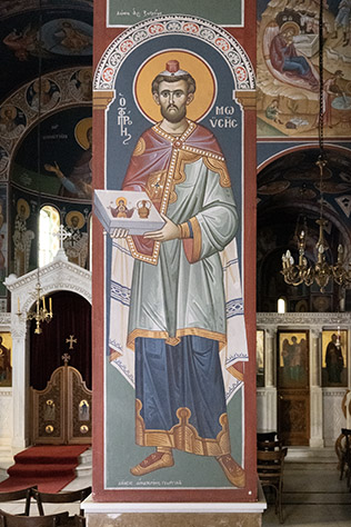 The Church of Panagia Kapnikarea dates to the eleventh century. It is one of the oldest churches in Athens. Photios Kontoglou painted the Theotokos Platytera in the apse in 1942, and completed the remaining icons on the walls in the early 1950s. The icon of Saint Catherine is on the east face of the arch to the north of the bema.
