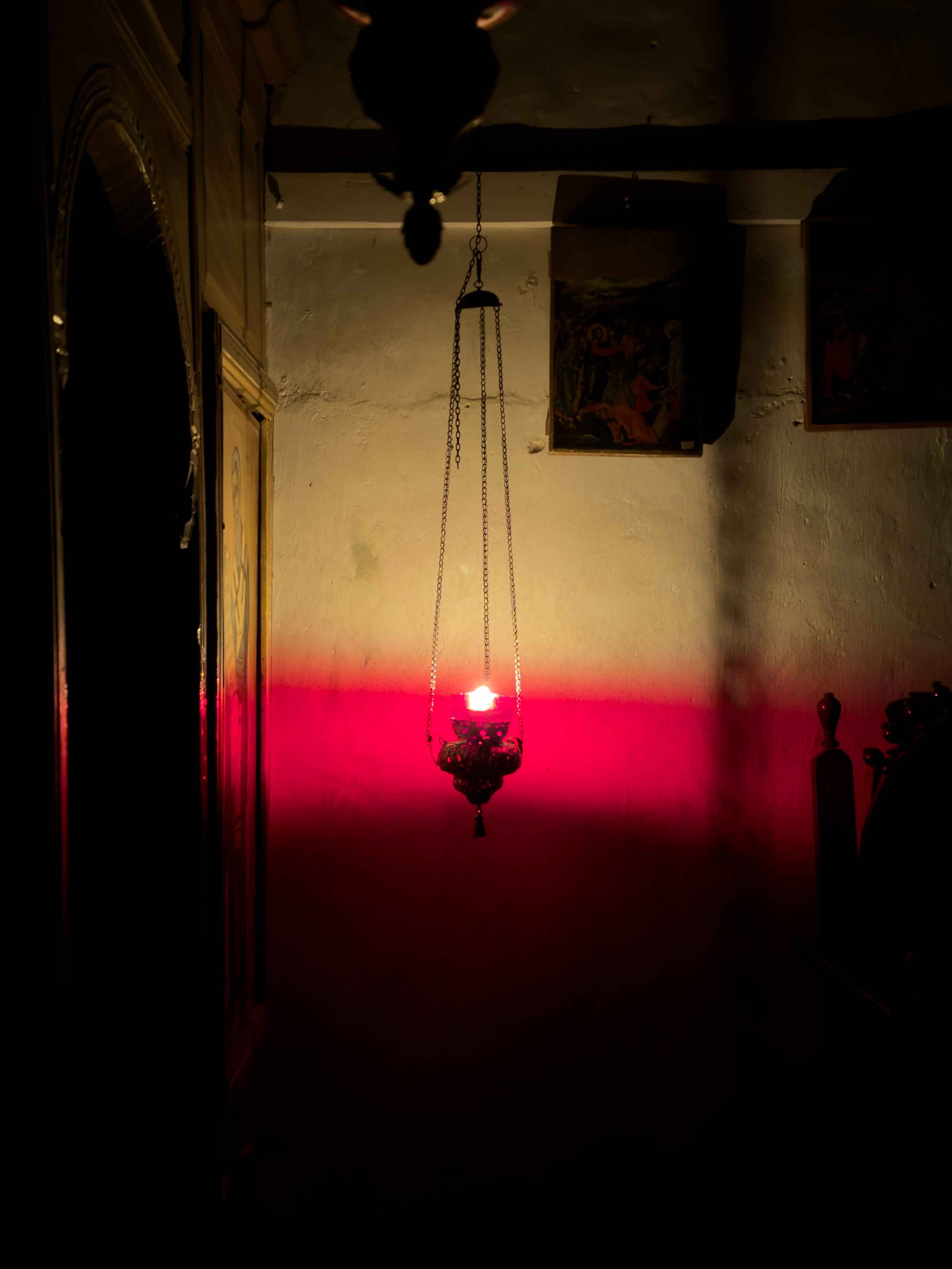 The icon lamp in the Chapel of Saint James, First Bishop of Jerusalem, at the beginning of Mesonyktikon, the Midnight Office.