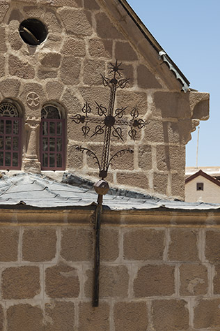 The wrought iron cross at the east end of the basilica. The lead roof protects the sixth century apse mosaic of the Transfiguration.