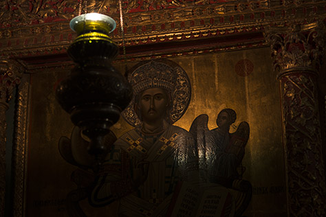 At the beginning of Mesonyktikon, the Midnight Office, the icon is lit only by the oil lamp kept burning before it.