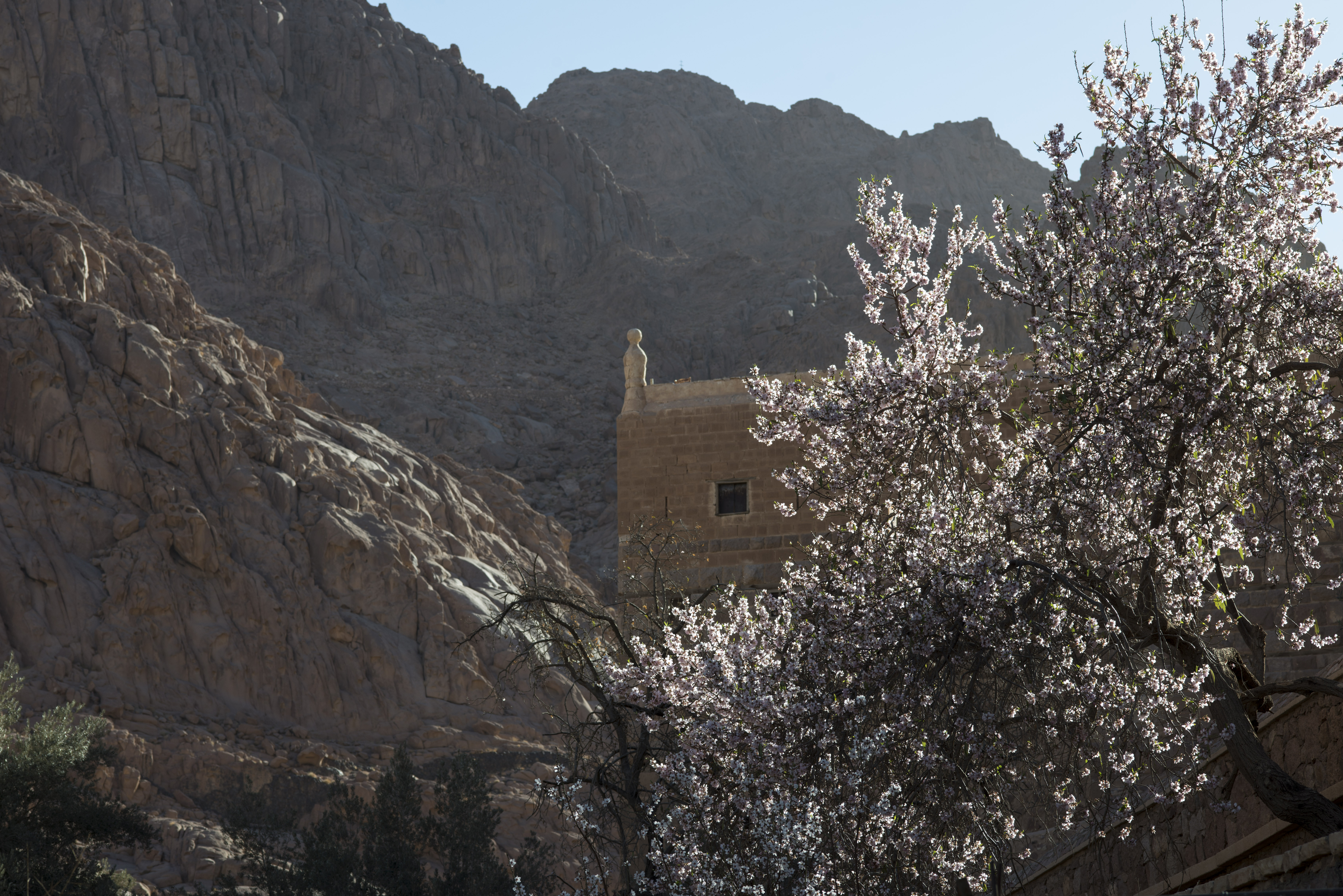 An almond tree in the morning sunlight, with the northwest corner of the monastery fortress wall.