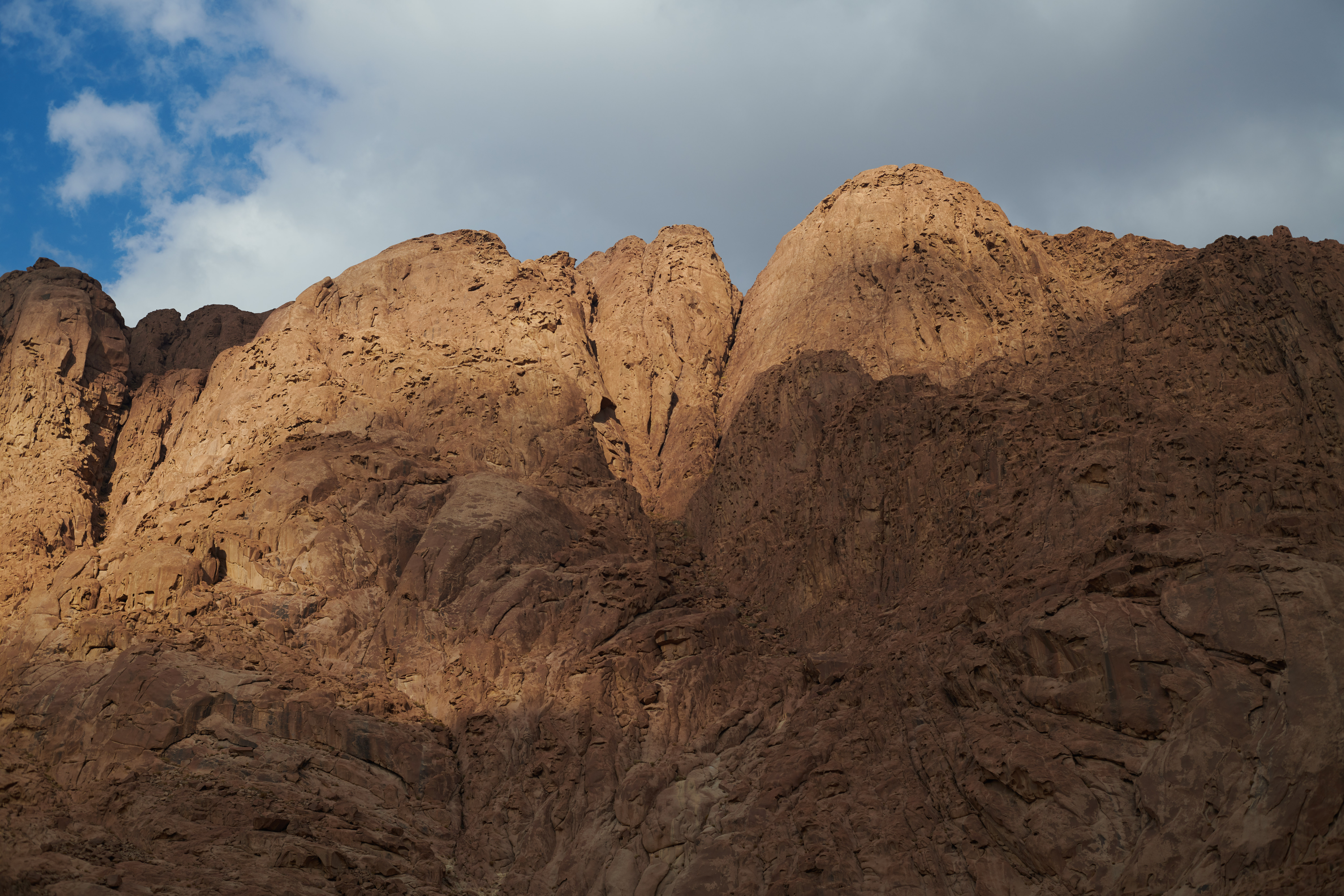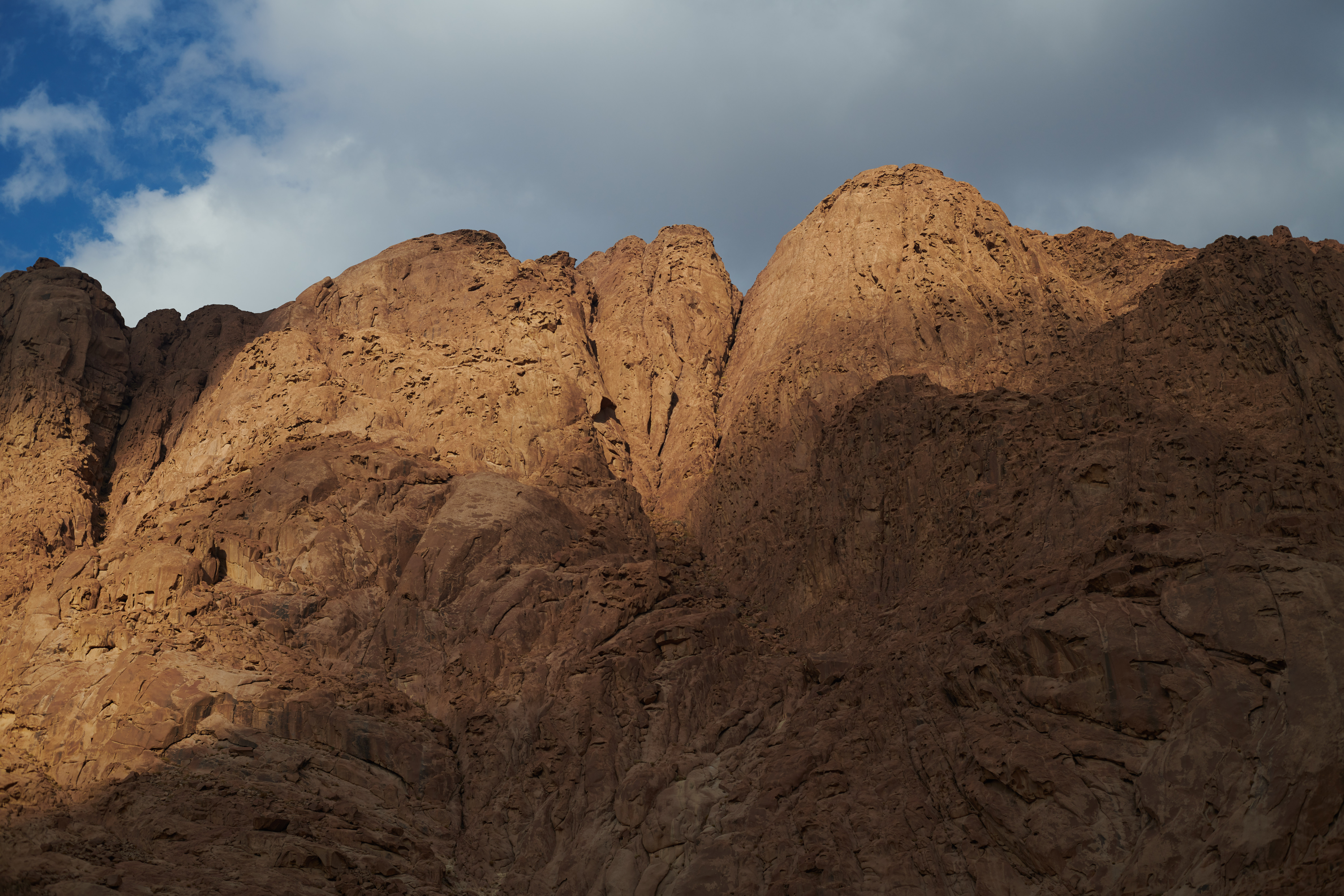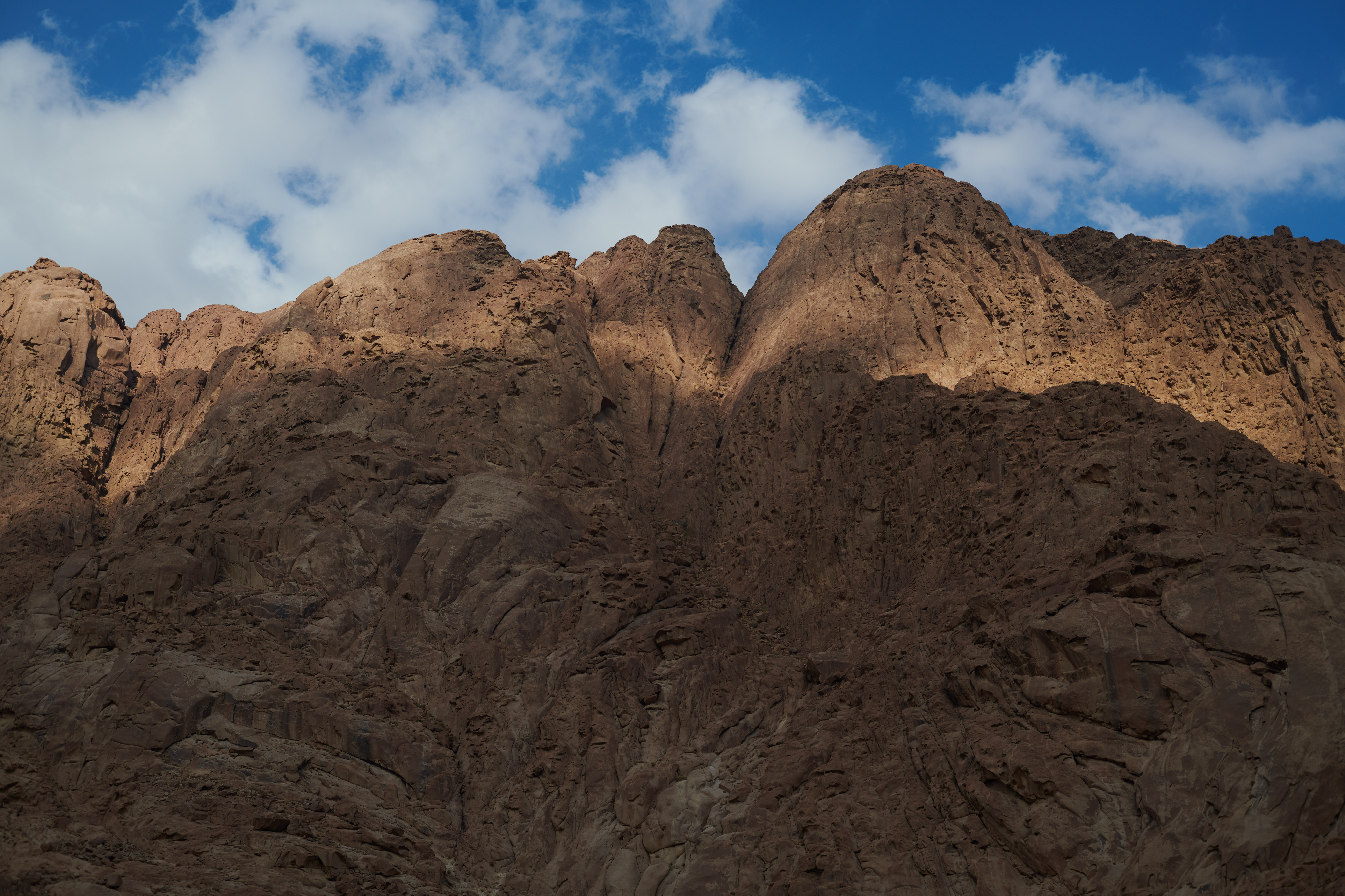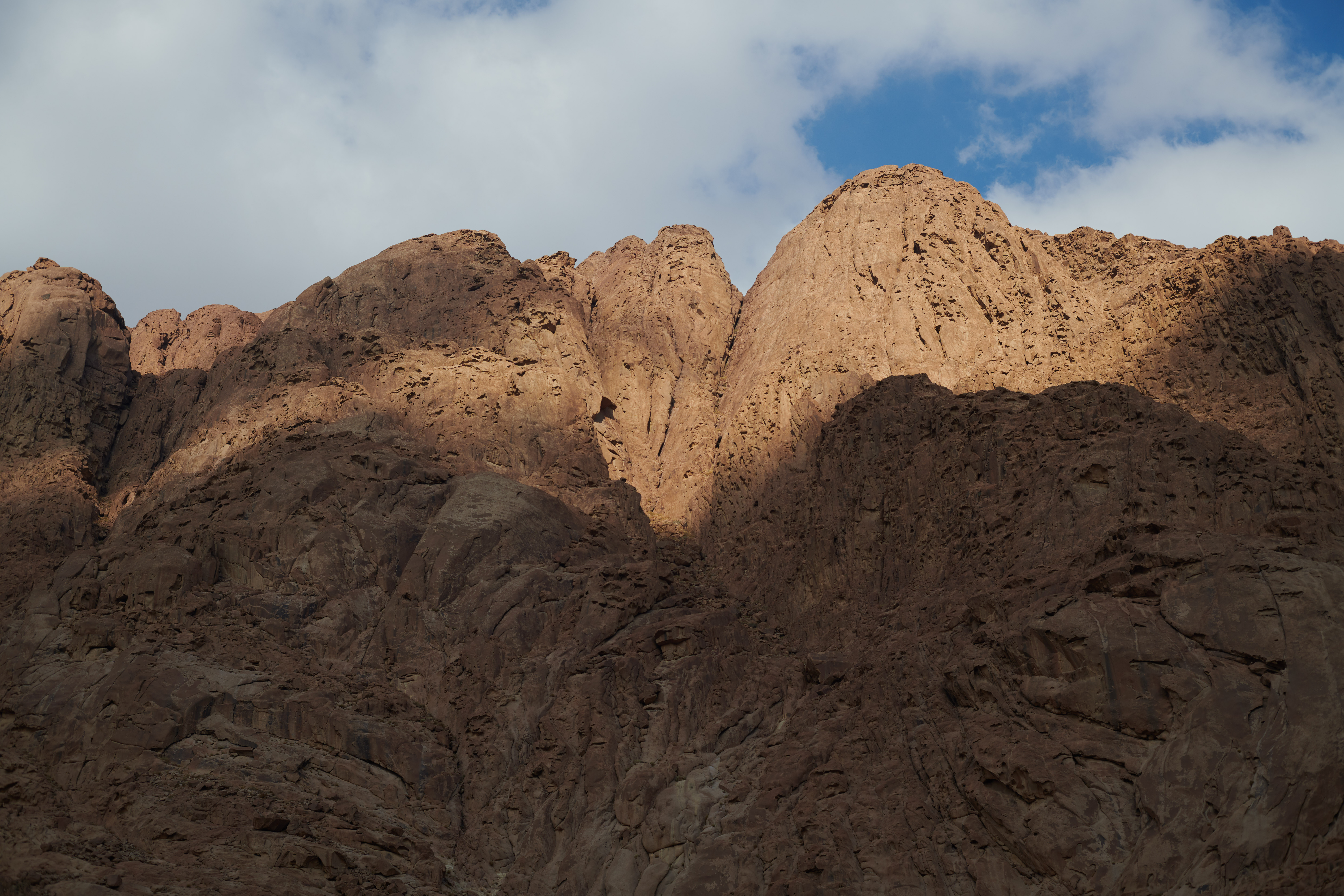Passing clouds create shadows on the precipitous mountains to the north of the monastery.
