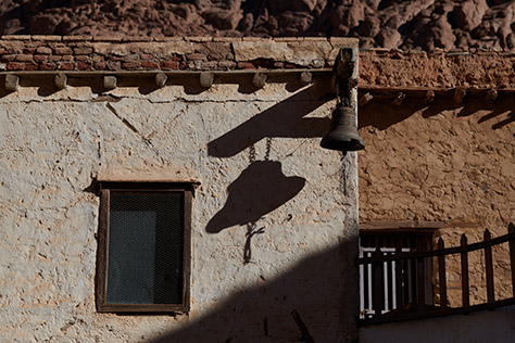 The mid-morning sun creates a shadow of the trapeza bell on the wall of the storeroom.