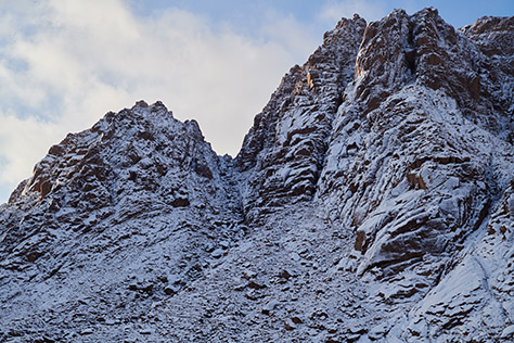 The highest mountains to the south of the monastery, lit by scattered sunlight.