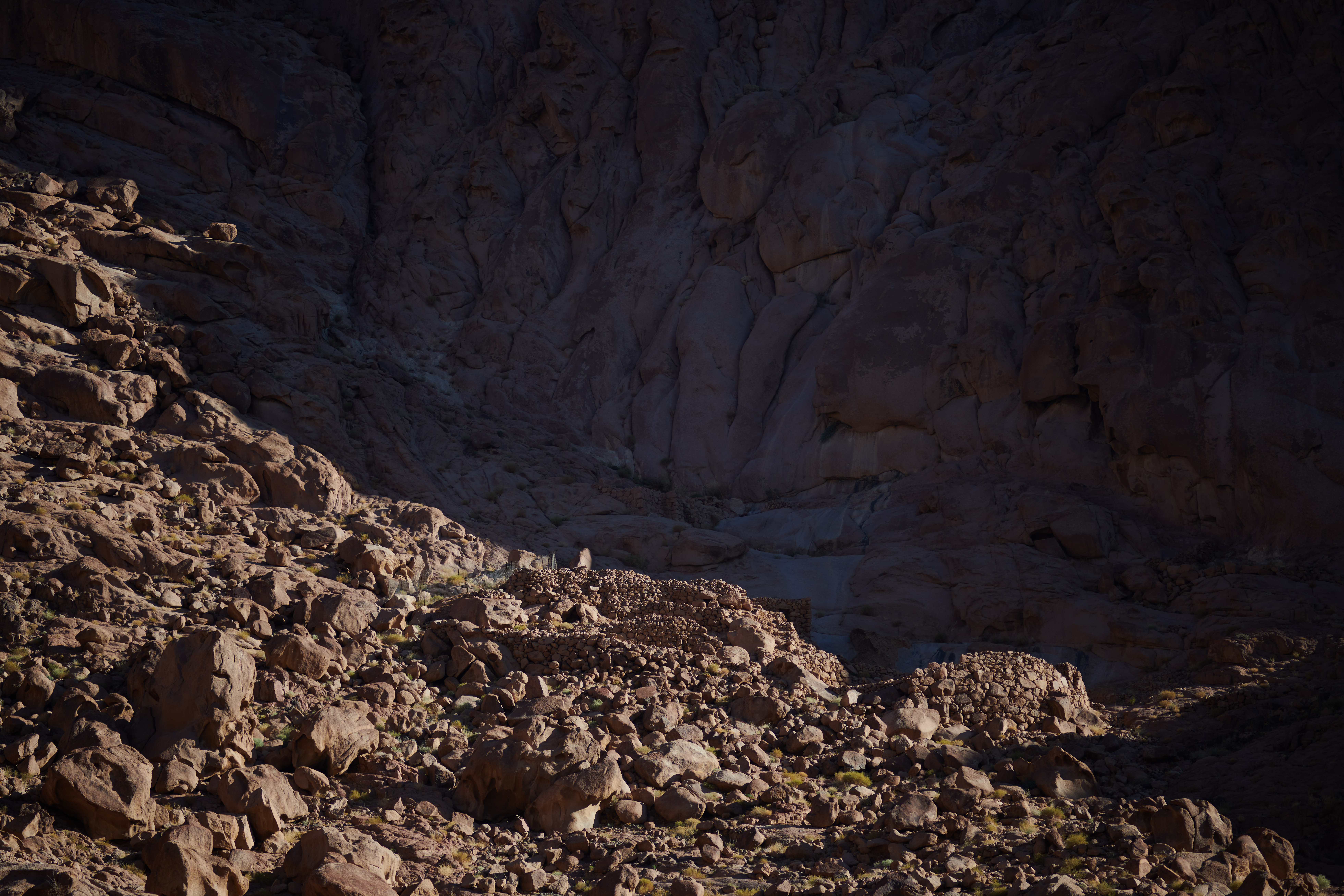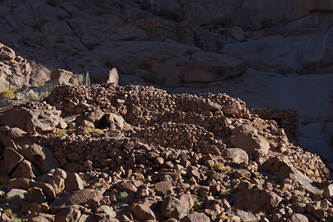 Ruined walls of ancient kellia on the north face above the monastery.