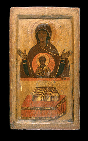 A small Sinai icon attributed to the fourteenth or fifteenth century depicts the All-holy Theotokos and the Ark of the Tabernacle.
