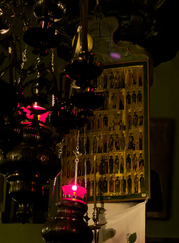 Icon lamps hanging before the icon depicting all of the saints whose feast days fall in the month of September.