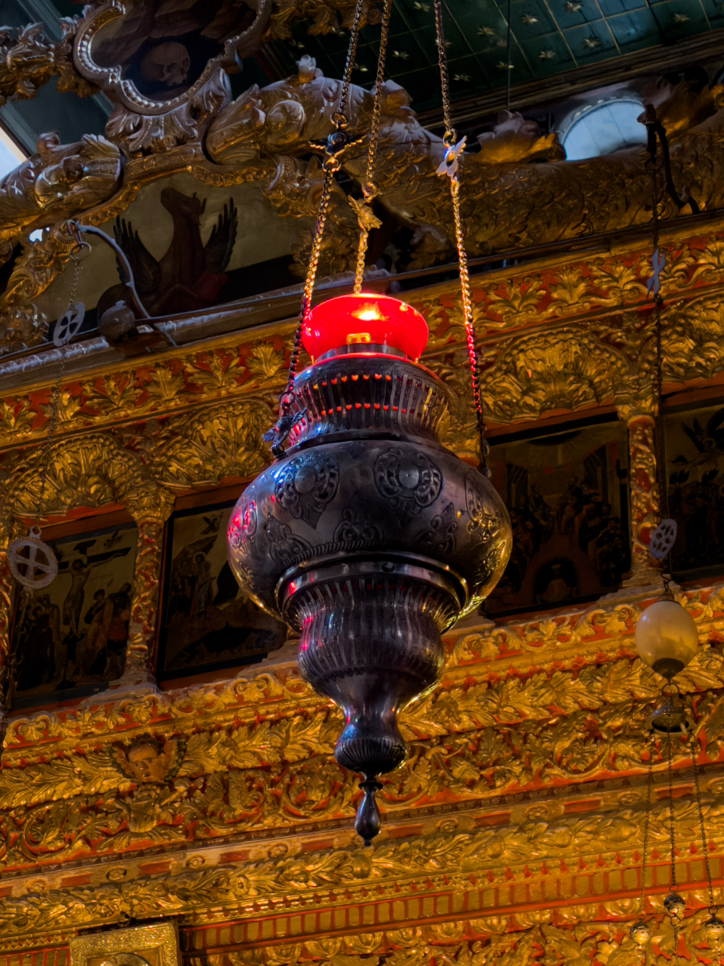 Icon lamps in front of the iconostasion are lit on Sundays and feast days.