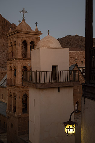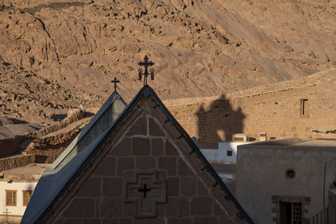 A classic view of the monastery, from the slopes on the north side. Bedouin on camels have taken pilgrims up the path to see the sunrise, and now they are returning home.