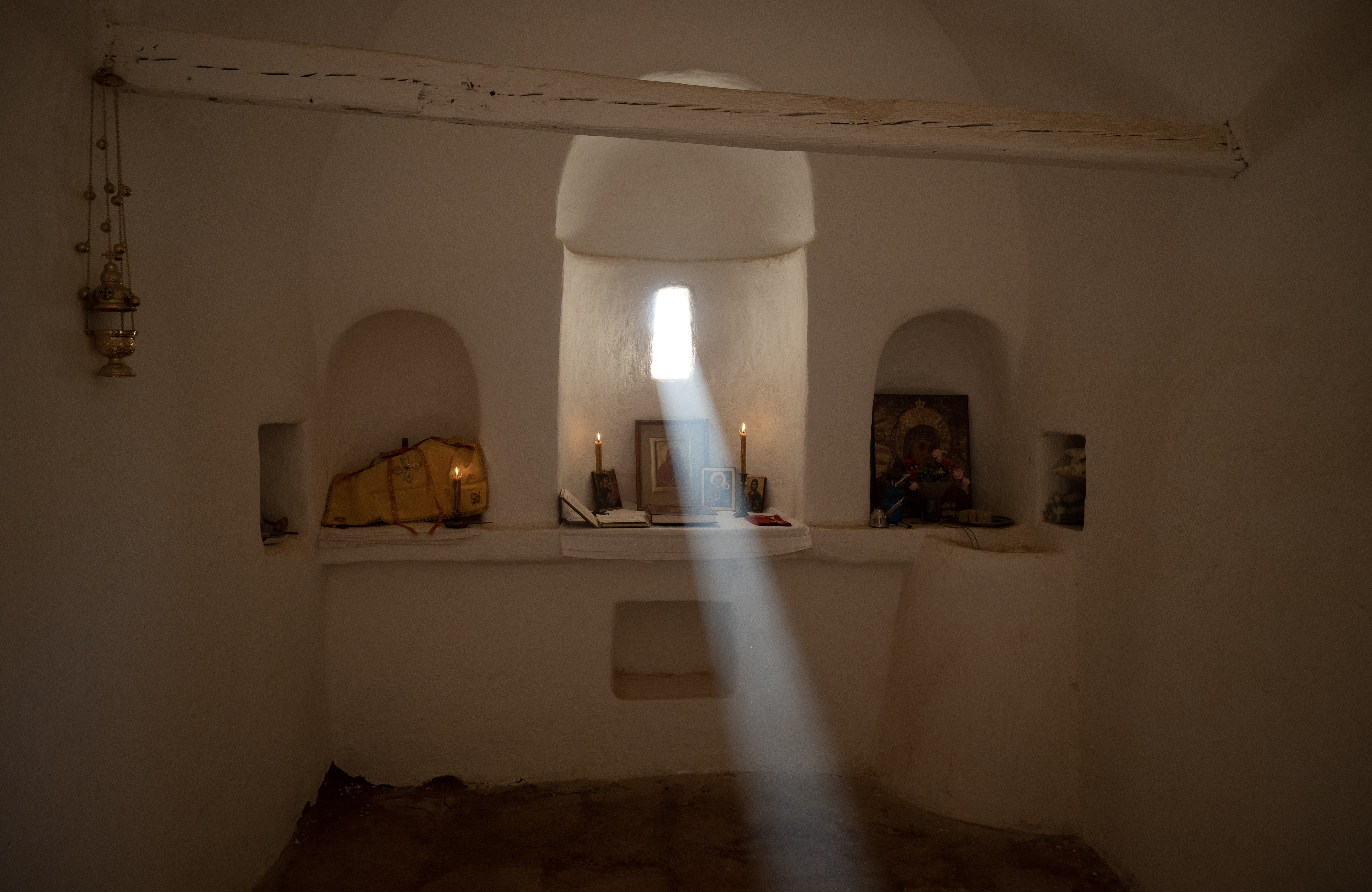 The wall above the old stairway leading to the trapeza was whitewashed. It is slowly regaining its patina.
