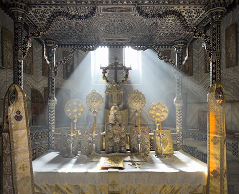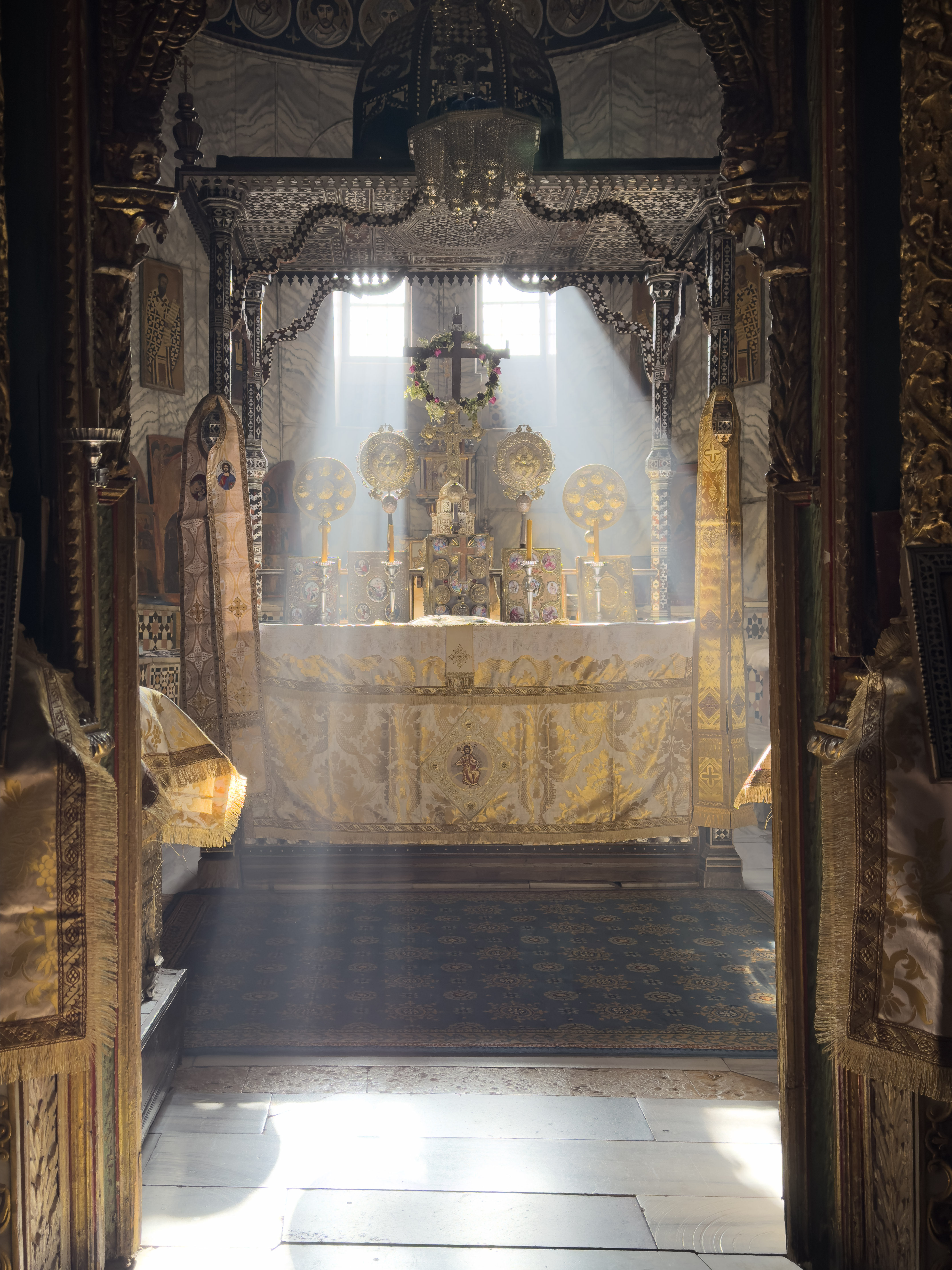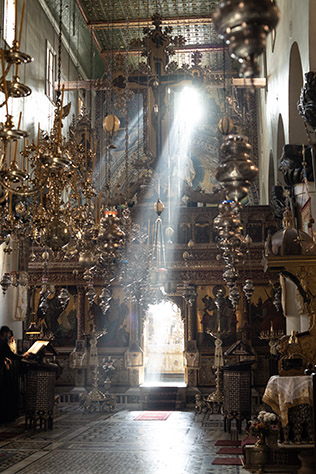 While I was at the chapel of the Prophet Elijah, a cat came by. A little bird on the roof of the chapel sounded the alarm for all the other birds that the cat was here. After basking in the warm sand for a while, the cat left to continue its patrol of the area. Perhaps today it would find a dove with it guard down for just a moment. How wonderful that would be. Χθὲς συνεθαπτόμην σοι Χριστὲ συνεγείρομαι σήμερον ἀναστάντι σοι, συνεσταυρούμην σοι χθὲς, αὐτός με συνδόξασον Σωτήρ, ἐν τῇ βασιλείᾳ σου. Yesterday I was buried with Thee, O Christ, and today I arise with Thine arising. Yesterday was I crucified with Thee; do Thou Thyself glorify me with Thee, O Saviour, in Thy Kingdom. — From the Third Ode of the Paschal Canon Καὶ ἐξήγαγεν αὐτοὺς ἐκ σκότους καὶ σκιᾶς θανάτου καὶ τοὺς δεσμοὺς αὐτῶν διέρρηξεν. He brought them out of darkness and the shadow of death, and brake their bands in sunder. (Psalm 106:14 LXX) Ὅτι ὁ Θεὸς ὁ εἰπών Ἐκ σκότους φῶς λάμψαι ὃς ἔλαμψεν ἐν ταῖς καρδίαις ἡμῶν πρὸς φωτισμὸν τῆς γνώσεως τῆς δόξης τοῦ Θεοῦ ἐν προσώπῳ Ἰησοῦ Χριστοῦ. For God, who commanded the light to shine out of darkness, hath shined in our hearts, to give the light of the knowledge of the glory of God in the face of Jesus Christ. (2 Corinthians 4:6) Ἐξαλείψας τὸ καθ’ ἡμῶν χειρόγραφον τοῖς δόγμασιν ὃ ἦν ὑπεναντίον ἡμῖν καὶ αὐτὸ ἦρκεν ἐκ τοῦ μέσου προσηλώσας αὐτὸ τῷ σταυρῷ· ἀπεκδυσάμενος τὰς ἀρχὰς καὶ τὰς ἐξουσίας ἐδειγμάτισεν ἐν παρρησίᾳ θριαμβεύσας αὐτοὺς ἐν αὐτῷ. Blotting out the handwriting of ordinances that was against us, which was contrary to us, and took it out of the way, nailing it to his cross; and having spoiled principalities and powers, he made a shew of them openly, triumphing over them in it. (Colossians 2:14-15) The first of the twelve Gospels is what is known as Christ’s High Priestly Prayer, John 13:31 – 18:1. Οὐ περὶ τούτων δὲ ἐρωτῶ μόνον ἀλλὰ καὶ περὶ τῶν πιστευσόντων διὰ τοῦ λόγου αὐτῶν εἰς ἐμέ ἵνα πάντες ἓν ὦσιν καθὼς σύ πάτερ ἐν ἐμοὶ κἀγὼ ἐν σοί ἵνα καὶ αὐτοὶ ἐν ἡμῖν ἓν ὦσιν. Neither pray I for these alone, but for them also which shall believe on me through their word; that they all may be one; as thou, Father, art in me, and I in thee, that they also may be one in us. (John 17:20-21) The floor of the bema inside the Sinai basilica, lit by a single candle. The floor is made of inlaid marble and hardstones, now very worn after the passage of so many years. |