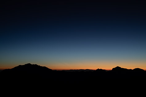 A salmon pink light on the horizon heralds the arrival of a new day.