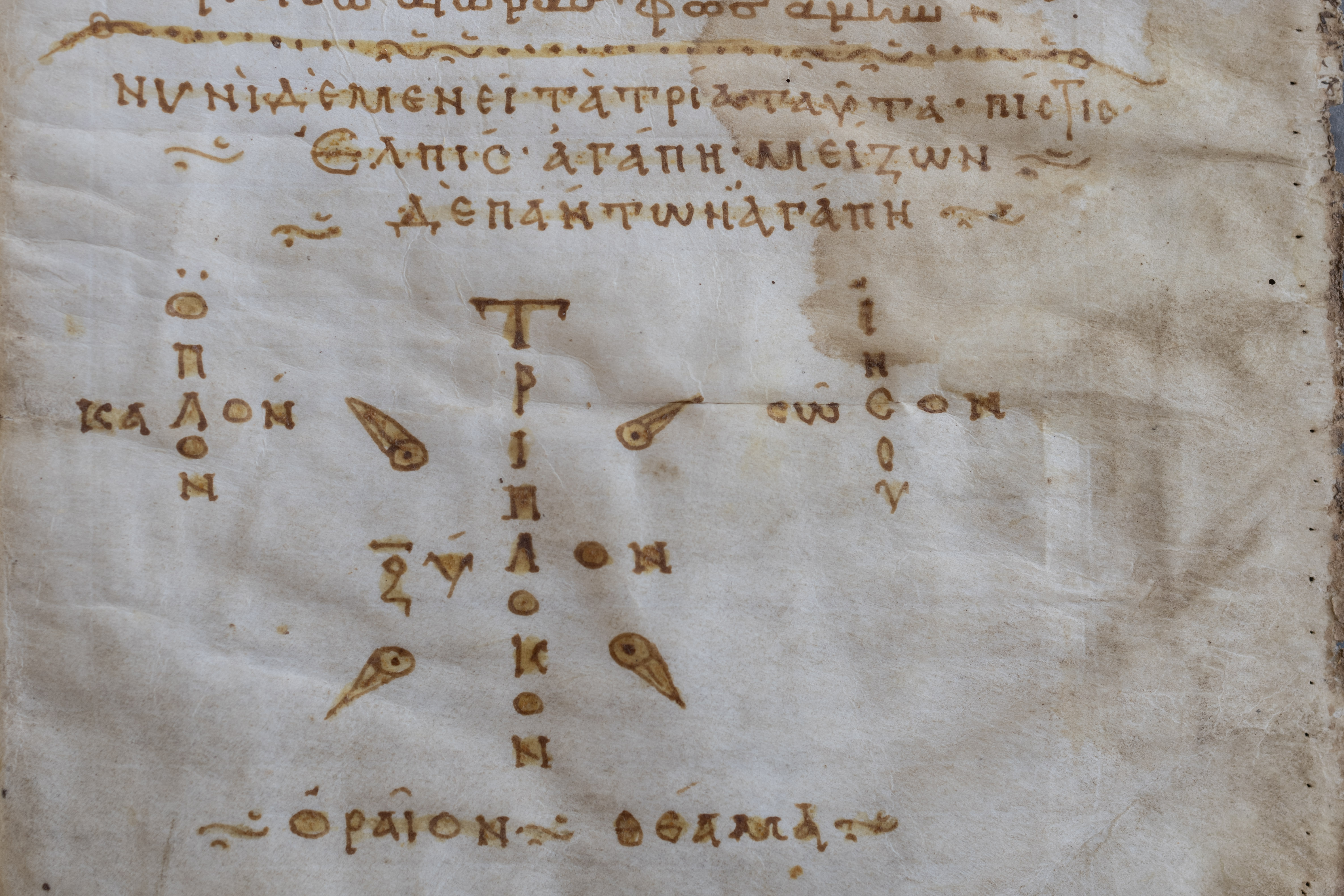 Sinai manuscript Greek New Finds Minuscule 134 is an incomplete copy of the Ladder of Divine Ascent. It is written on parchment, and has been dated to the tenth or eleventh century. Saint John Climacus concludes his great work with a quotation of the last verse of the thirteenth chapter of First Corinthians, Νυνὶ δὲ μένει τὰ τρία ταῦτα· πίστις ἐλπίς αγάπη· μείζων δὲ πάντων ἀγάπη, ‘And now abideth these three: faith, hope, love; but the greatest of all is love.’ (I Corinthians 13:13)