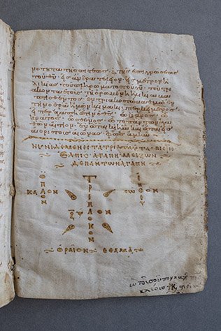 When two Greek words share a common central letter, they can be written in cross form. Below, the scribe has written (on the left), ὅπλον καλόν, ‘A good shield’ (a reference to Ephesians 6:11). To the right, he has written, Ἰησοῦ σῶσον, ‘Jesus save us’. And in the centre he has written τρίπλοκον ξύλον ὀραῖον θέαμα, ‘Threefold Wood, wondrous vision’. The Cross was made from cedar, pine, and cypress.