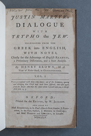 The first English translation of Saint Justin Martyr’s Dialogue with Trypho was made by Henry Brown, Vicar of Nether-Swell in Gloucestershire. It was printed in two volumes in Oxford in 1755.